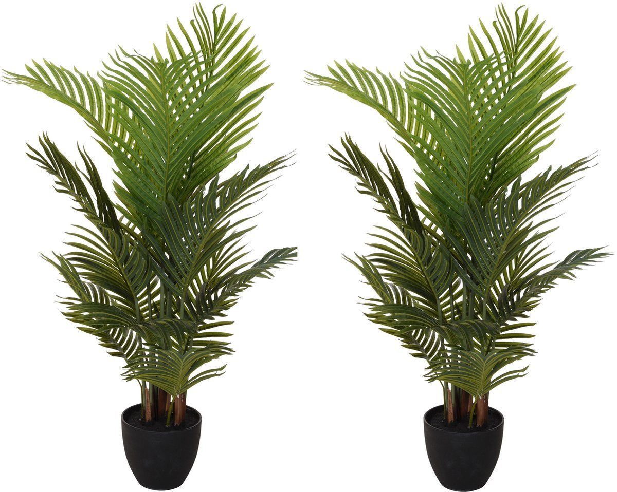3x Groene kunst goudpalm planten in pot 94 cm. Een volle groene kunst/nep palm, geleverd in een zwarte pot. De plant is niet UV-bestendig en daarom enkel geschikt voor binnenshuis.